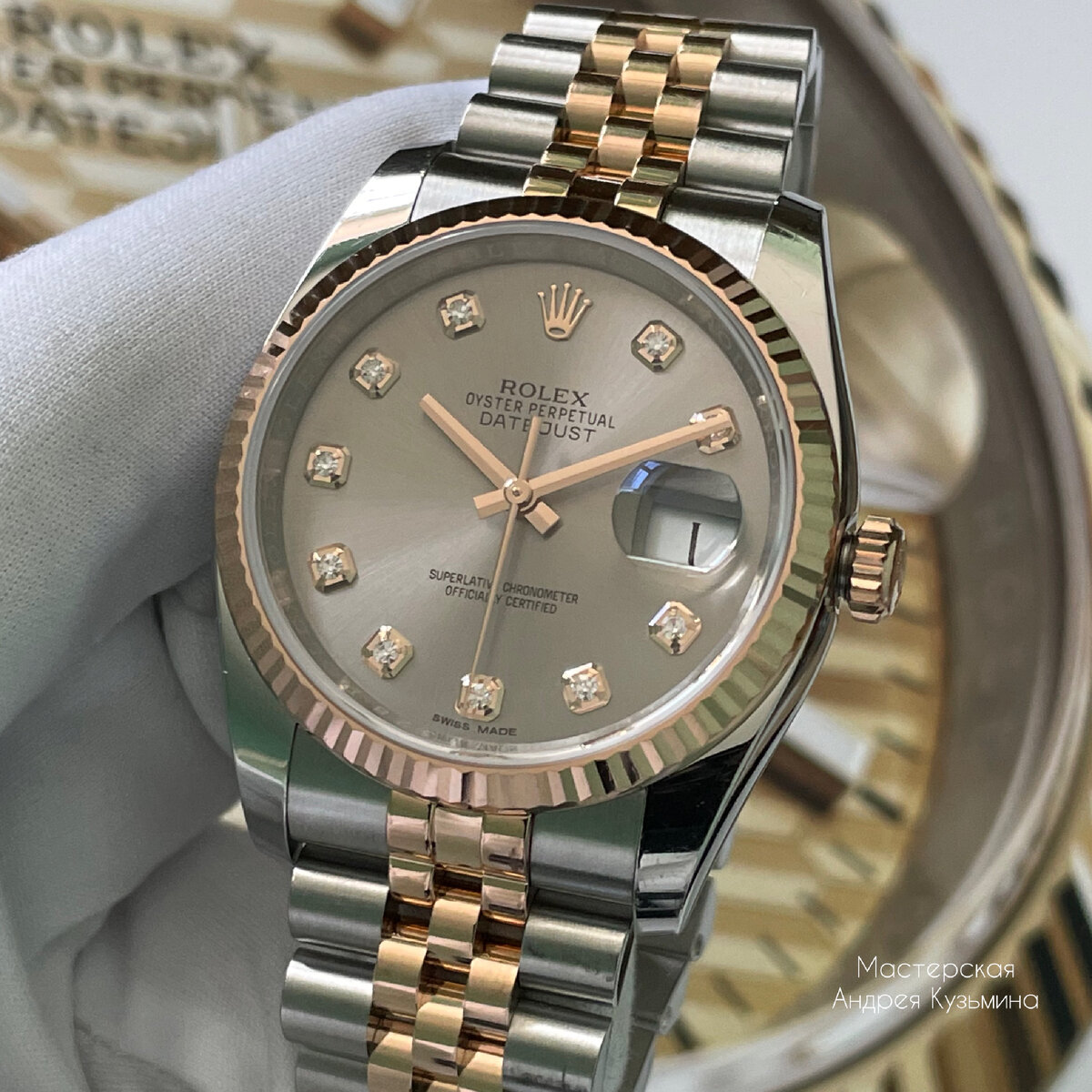 Добрый вечер друзья и читатели моего канала. Компания «Rolex» основана в 1905 году немцем Гансом Вильсдорфом и его зятем Альфредом Дави (Alfred Davis), но как компания «Wilsdorf and Davis». А свое название «Rolex» было зарегистрировано только в 1915 году. И вот, в 1945 году, была выпущена модель часов Datejust. Это был прорыв в компании, это были самые первые наручные часы с автоподзаводом, которые оснащены автоматически меняющимся указателем даты в отдельном окошке на отметке «3 часа». Сейчас это воспринимается как должное в часах, а в 40-х годах - опция показа даты стала перспективным и важным элементом. Rolex подчеркнула на своей презентации, что главная техническая привлекательность часов заключается в том, что у них есть механизм, который способен менять дату именно в полночь. С тех пор, такая функция на наручных часах стала самой популярной. А теперь немного поговорим с Вами о часах, которые побывали в моей мастерской. А именно, Rolex Datejust в корпусе из нержавеющей стали и