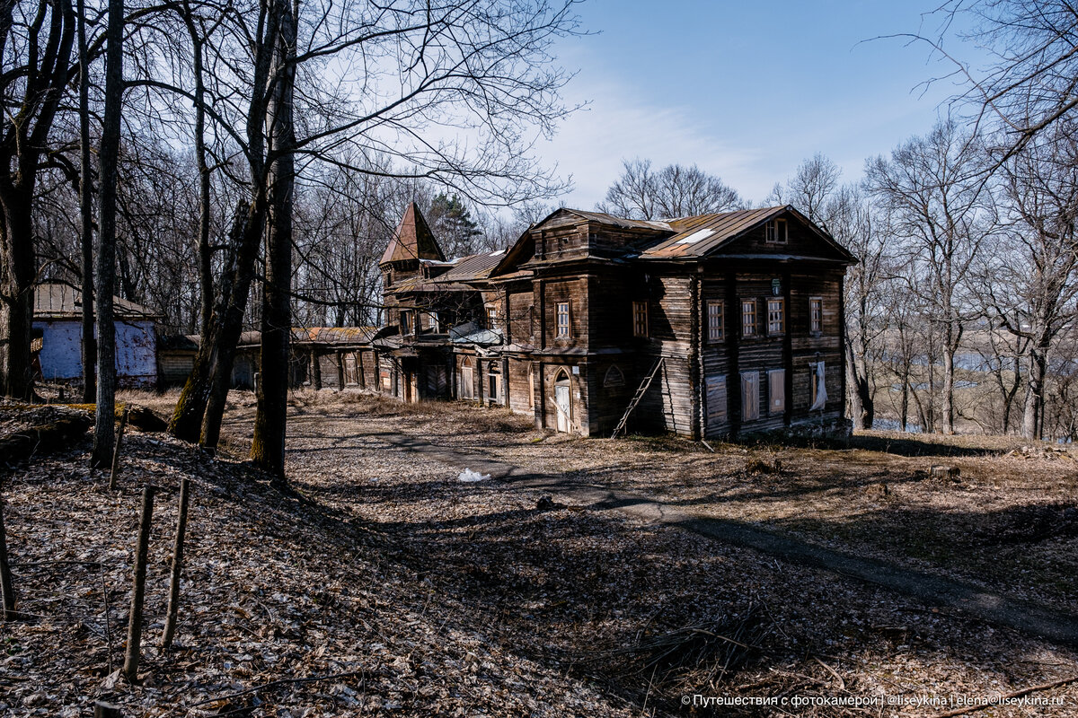 Этот усадебный дом надежно укрыт в парке. Удивительно, но его не видно, пока не подойдёшь вплотную. С одной стороны — река и старый заросший парк, а с другой — небольшая возвышенность и снова то, что раньше было парком, а сейчас больше похоже на лес. В какой-то момент даже закралась мысль: "А не развалилась ли усадьба совсем?" Пришлось до последнего полагаться на карты и навигатор. Последние пару десятков километров дорога петляет по красивому лесу, и кажется, что вокруг нет ни единой деревни. Но в какой-то момент она обрывается закрытыми воротами за знаком "Въезд запрещён". Пытаюсь попасть к цели окольными путями, но упираюсь в огороды и глухой забор. Кстати, берег реки тут тоже огорожен забором. Кажется, это не очень законно или я что-то путаю? Забор (и всё, что внутри него) сейчас принадлежит подворью женского Свято-Успенского Вышинского монастыря, и усадьба находится на его территории. Возвращаюсь к закрытым воротам и ставлю машину в ближайших зарослях. Толкаю калитку без особо
