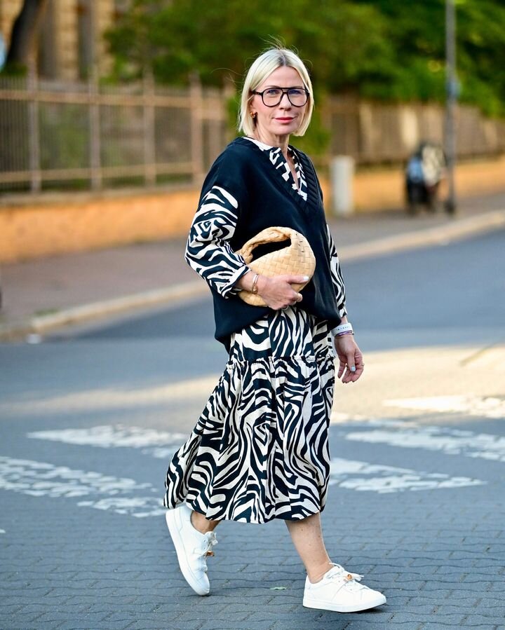 Сегодня не нужно жертвовать своим комфортом ради моды. Стиль спорт-шик дает женщине свободу, позволяет чувствовать себя элегантно даже в худи и кроссовках. Сегодня рассмотрим 11 эффектных весенне-летних ансамблей для модниц 50+. Платье с контрастным принтом отлично смотрится в обществе свободного жилета. Повседневный сет целесообразно завершить компактным аксессуаром и удобной обувью, например базовыми белыми кроссовками. Желтая рубашка + пестрая юбка миди – красиво и по-весеннему свежо! Дополните наряд кедами, которые позволят весь день провести на ногах, не ощущая усталости. Брючные костюмы великолепно ладят и с элегантной обувью, и со спортивными моделями. Если вы являетесь поклонницей стиля спорт-шик, то выбирайте второй вариант. Кеды и кроссовки убирают лишнюю строгость из образа, делают его оригинальным и запоминающимся. Самые стильные и смелые дамы с удовольствием сочетают юбку с кожанкой. Куртка из матовой кожи добавляет ансамблю дерзкую нотку. Это может быть юбка из плотно