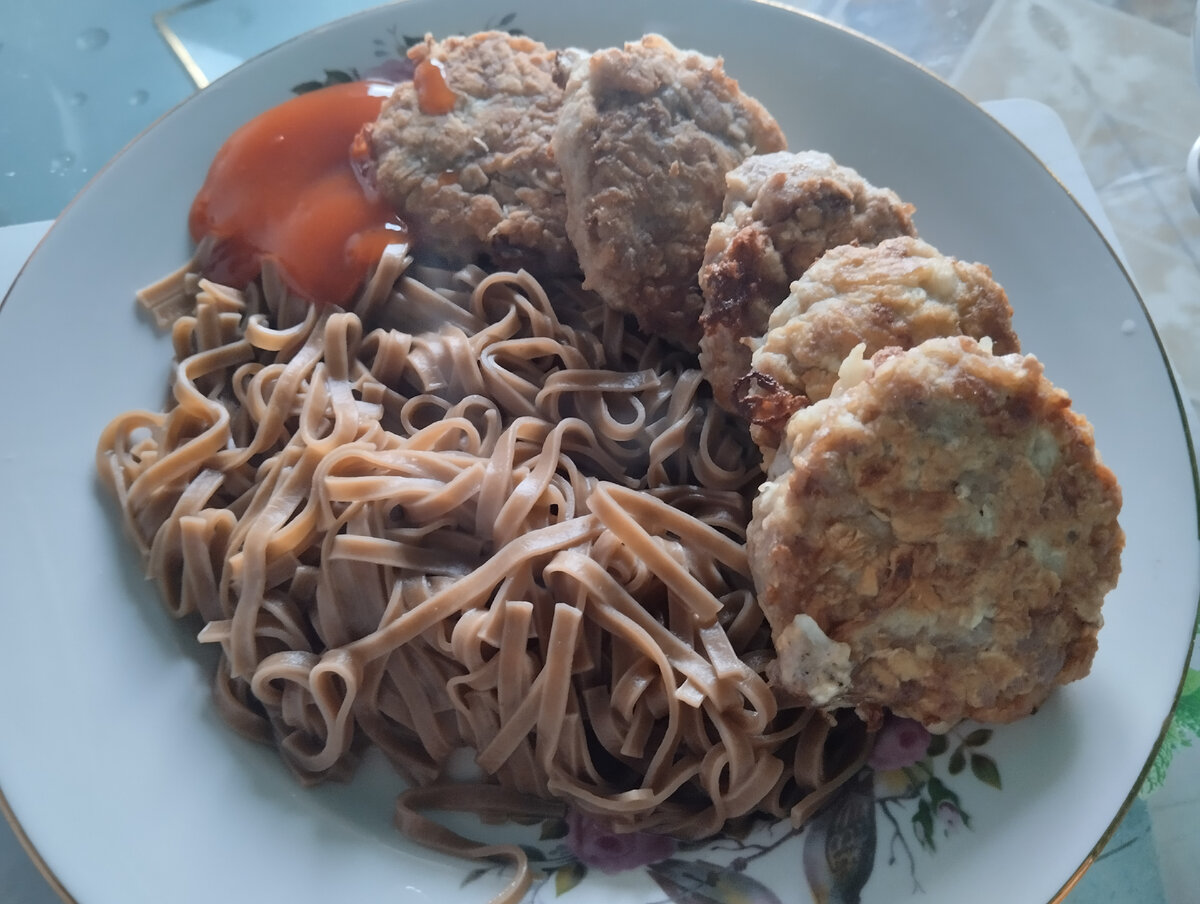 Привет, друзья! Сегодня я, вернулась в город из деревни, у меня будет ещё одна неделя лечения в дневном стационаре На лечение я приехала к 9ти, в 13 часов была уже дома. Решила приготовить котлеток себе. Благо по дороге к дому купила говяжьего фарша упаковку. По обычаю я делаю котлеты из четверти упаковки. То есть беру 100 гр фарша, луковицу, яйцо, всё перемешиваю. Иногда добавляю зелень или тёртый картофель. А этот раз решила немного овсянки добавить, сухого Геркулеса. Ложку примерно добавить можно к фаршу. Потом слепила котлеты, обвалила в муке и пожарила. Лапшу гречневую покупала как-то в Фикс прайсе, вкусная. Мне понравилась она. Вот такой к меня был обед-ужин. А вы любите гречневую лапшу? А рисовую? Ваша Лейла