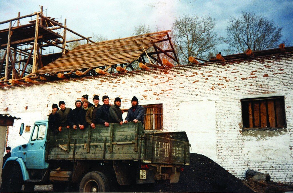 Жили тогда монахи в спартанских условиях. Денег было мало, здание бывшей ремонтно-тракторной мастерской, действующей в советские времена на месте старого храма, стояло без окон и дверей. Чтобы хоть как-то утеплить стены, монахи делали саман из глины и соломы. Сами жили в небольшом домике, когда-то служившем кочегаркой, где температура воздуха выше +12 не поднималась.