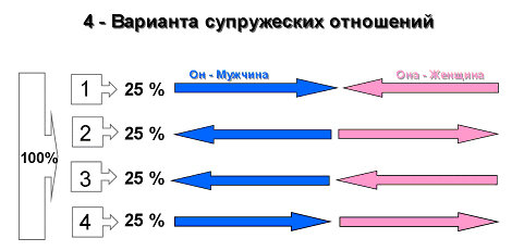 В сегодняшнее, современное технократическое время существует 4 варианта отношений между мужским и женским началом (энергии), посмотрим нам на следующую графику (Рис. 1).