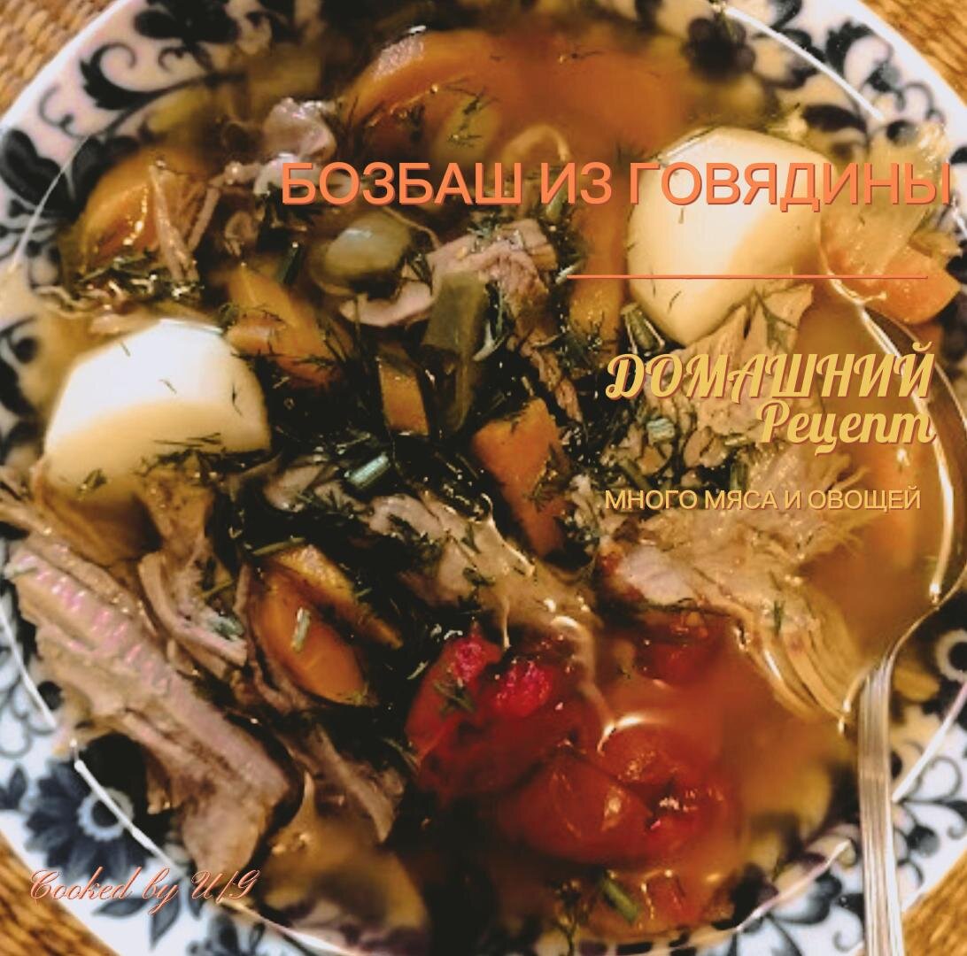 Густой, насыщенный суп, состоящий в основе из мяса, с большим количеством овощей и зелени. Понадобятся: 1. Говядина лопатка на кости 1 кг. 2. Картофель 0,5 кг. В идеале сорт бэби. 3. Лук репчатый 1шт. 4. Морковь 2шт. 5. Болгарский перец 1 красный, 1 зелёный. 6. Острый перец 1шт. 7. Помидоры 0,5 кг. Сорт черри. 8. Зелень : Сельдерей, Петрушка, Кинза. 100 гр. 9. Томатная паста 2 столовых ложки, соль, перец, специи по вкусу. Говяжью лопатку заливаем холодной водой, ставим на огонь, доводим до кипения, снимаем пенку, закладываем одну головку лука, одну морковь, душистый горошек, лаврушку и варим на медленном огне 1,5 часа. Достаём мясо, фильтруем бульон (отварной лук, морковь, лаврушку душистый горошек, отделяем) В чистый, процеженный бульон, нарезаем отварную говядину, закладываем картофель, морковь, помидоры и варим ещё 10-15 минут. Мясо и Овощи в Бозбаш принято закладывать крупной нарезки, по этому. исходя из индивидуальных предпочтений в этом вопросе, режем красиво и крупно. Нарезанн