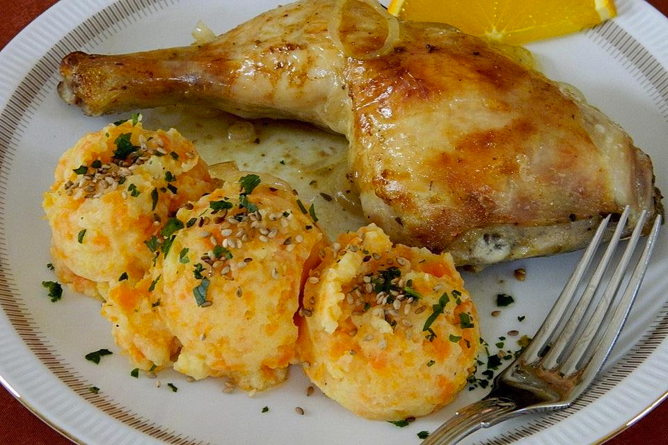 И вот как его было не попробовать? В картофельное пюре что только не добавляют – кто-то сливки, а кто-то сметану, кто-то обязательно кладет желток, а в классическом рецепте его от Робюшона используется невероятное количество масло – половина от веса картофеля. А тут – апельсиновый сок. Да-Да. И морковка. Говорят, рецепт родом с Востока. Не могу утверждать, правда это или нет. Берем: Как готовим: Картофель и морковь чистим, режем и отвариваем в соленой воде как обычно на пюре – до готовности. А дальше, в горячем виде перетираем толкушкой или миксером до состояния пюре, прибавляя понемногу апельсиновый сок и сдобрив приправами, тахини и давленым чесноком. Пюре в идеале должно получиться не жидким, но не слишком густым. Подаем, присыпав кунжутом. От себя хочу добавить – в изначальном виде в нем нет масла, и это, как по мне, портит вкус. Все таки мы не привыкли к «сухой» картошке, она не «шелковистая» ( этой самой шелковистости и добиваются большим количеством масла). Потому на «попроб
