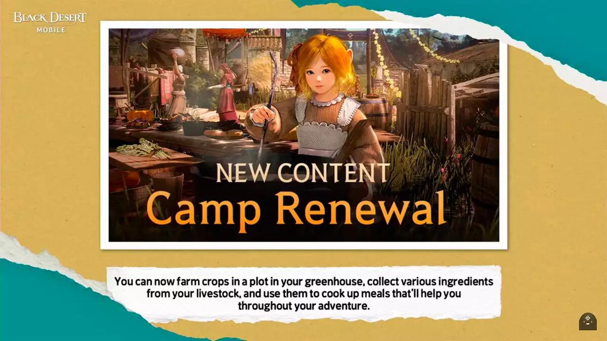 25 апреля 2023 года в Black Desert Mobile устанавливают свежее обновление с ивентами и контентом, разработчики провели существенную переработку лагеря. Теперь в персональном лагере можно заняться фермерством, построив теплицу и выращивая новые виды растений. Появилась глубокая система кулинарии с разными ингредиентами, опытом и баффами. Также можно собирать ресурсы со скота в BDM. В центре "Поля битвы за Солнце: Багровый ветер" добавлены специальные стены, защищающие от урона и дебаффа. Дополнительно в мобильной игре активированы ивенты "Дэбак", кулинарное мероприятие, миссия "Счастливый сундук" и обмен благодарностями. Новость на сайте: https://topinator.ru/509-iventy-i-obnovlennyj-lager-v-black-desert-mobile.html