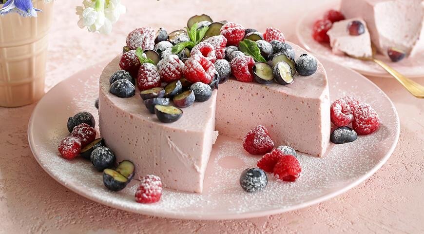 За сладость в этом фотогеничном торте в основном отвечают ягоды: малина и голубика. Без пудры можно и обойтись, если считаете калории и пытаетесь сделать десерты максимально полезными. Ягоды для рецепта лучше брать свежие, чтобы вкус у сметанника получился насыщенным. Кстати, в качества альтернативы малине и голубике допустимо выбрать что-то другое: например, клубнику и черную смородину. Или вовсе вместо ягод попробовать сделать сок из фруктов, поиграть с цветом и вкусом. Полный карт-бланш на эксперименты! Ингредиенты: Пошаговый рецепт ⬇️ Шаг 1 Отложите часть ягод для украшения. Оставшиеся ягоды измельчите погружным блендером до однородности и протрите через сито. Желатин залейте 150 мл холодной воды и оставьте на 20 мин. Шаг 2 Набухший желатин соедините с ягодным пюре. Нагревайте на медленном огне, помешивая, 2–3 мин, не доводя до кипения. Желатин должен раствориться. Снимите с огня и остудите, 10–15 мин. Влейте ягодную массу в миску, добавьте сметану и 80 г сахарной пудры и взбе
