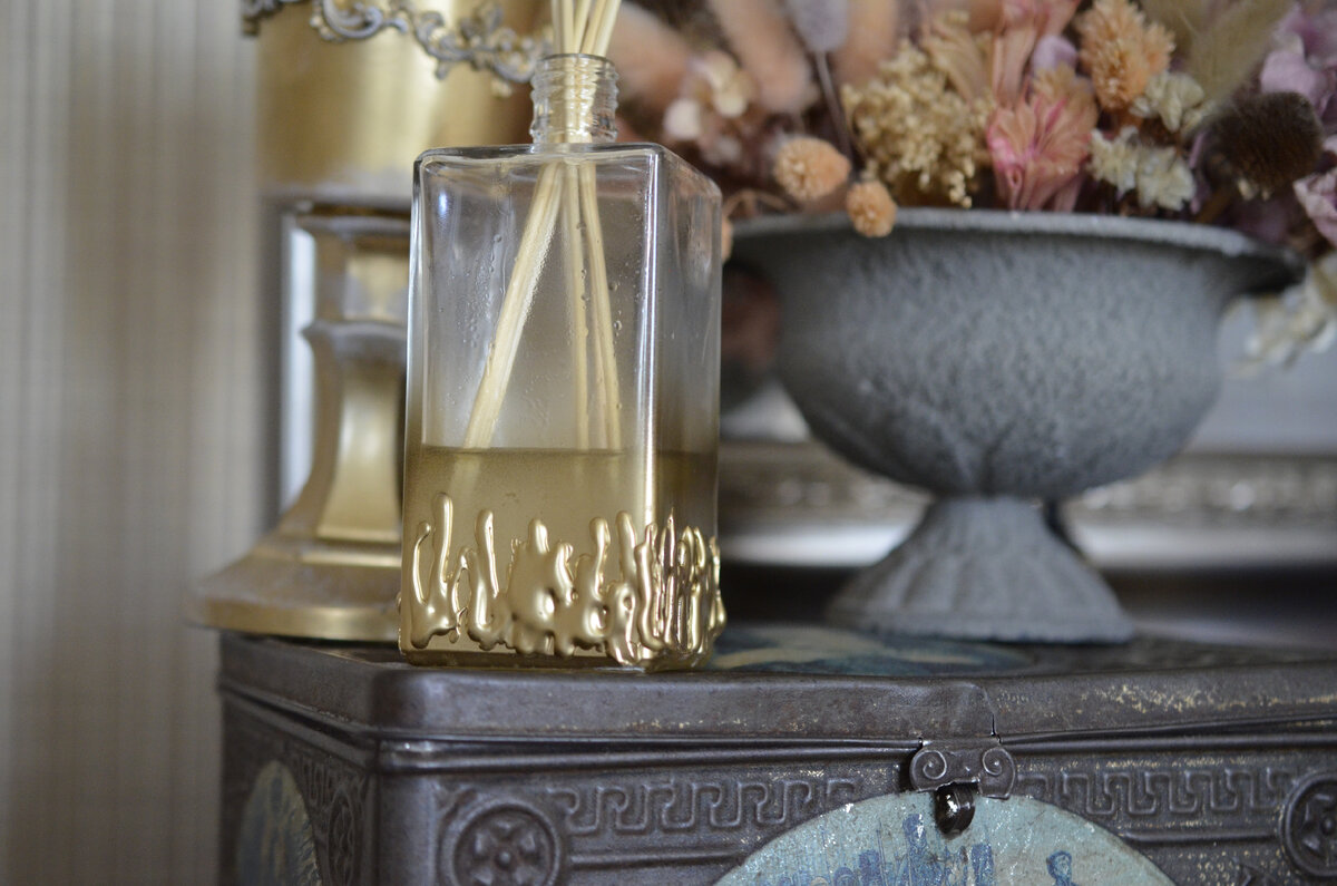 Я люблю, чтобы дома не только было красиво, но и хорошо пахло. Поэтому регулярно покупаю аромадиффузоры. Кто не знает, что это такое, одним словом Туалетная вода для дома. Но её нужно не распылять, а она постепенно испаряется через палочки, распространяясь аромат по помещению. Мой диффузор выветрился, а новый покупать удовольствие дорогое. Потому, что копеечные ароматы стоят день-два и запах исчезает. А качественные диффузоры стоят очень дорого. В общем у меня осталась стеклянная бутылочка, дома всегда есть эфирные масла и я решила сделать самостоятельно ароматизатор. Т.к на ёмкости был логотип фирмы, выпускающей ароматы для дома, я решила его как-то скрыть. Это будет изделие моего производства)) Поэтому горячим пистолетом, сделала на бутылочке подтеки. Давно хотела применить это вариант декора и возможность подвернулась. Когда клей подсох, я сбрызнула нижнюю часть золотой краской из баллончика. И таким образом сделала ненавязчивый и очень стильный декор бутылки. Такую не с