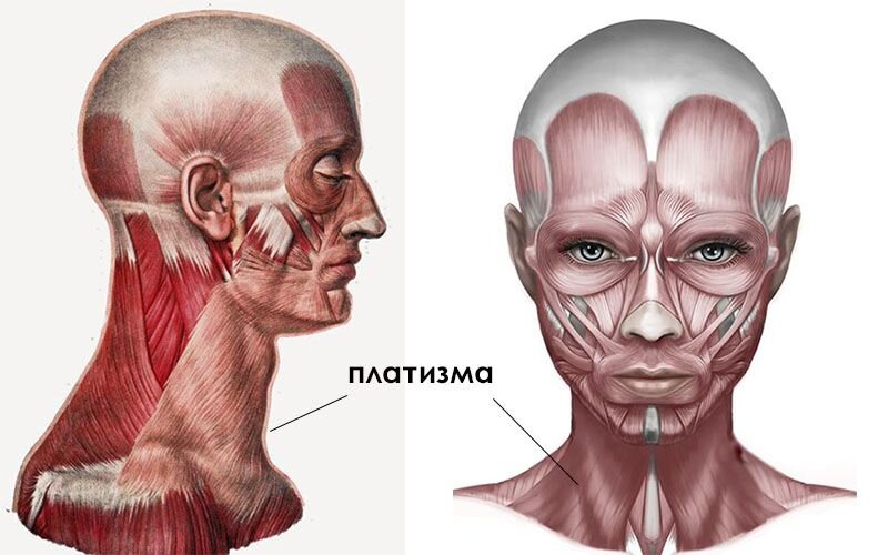 Платизма - подкожная мышца шеи, самая широкая из всех мимических мышц. Она вплетается в фасции и мягкие ткани грудной клетки в области груди и в области верхнего плечевого пояса, а выше в нижнюю треть лица.