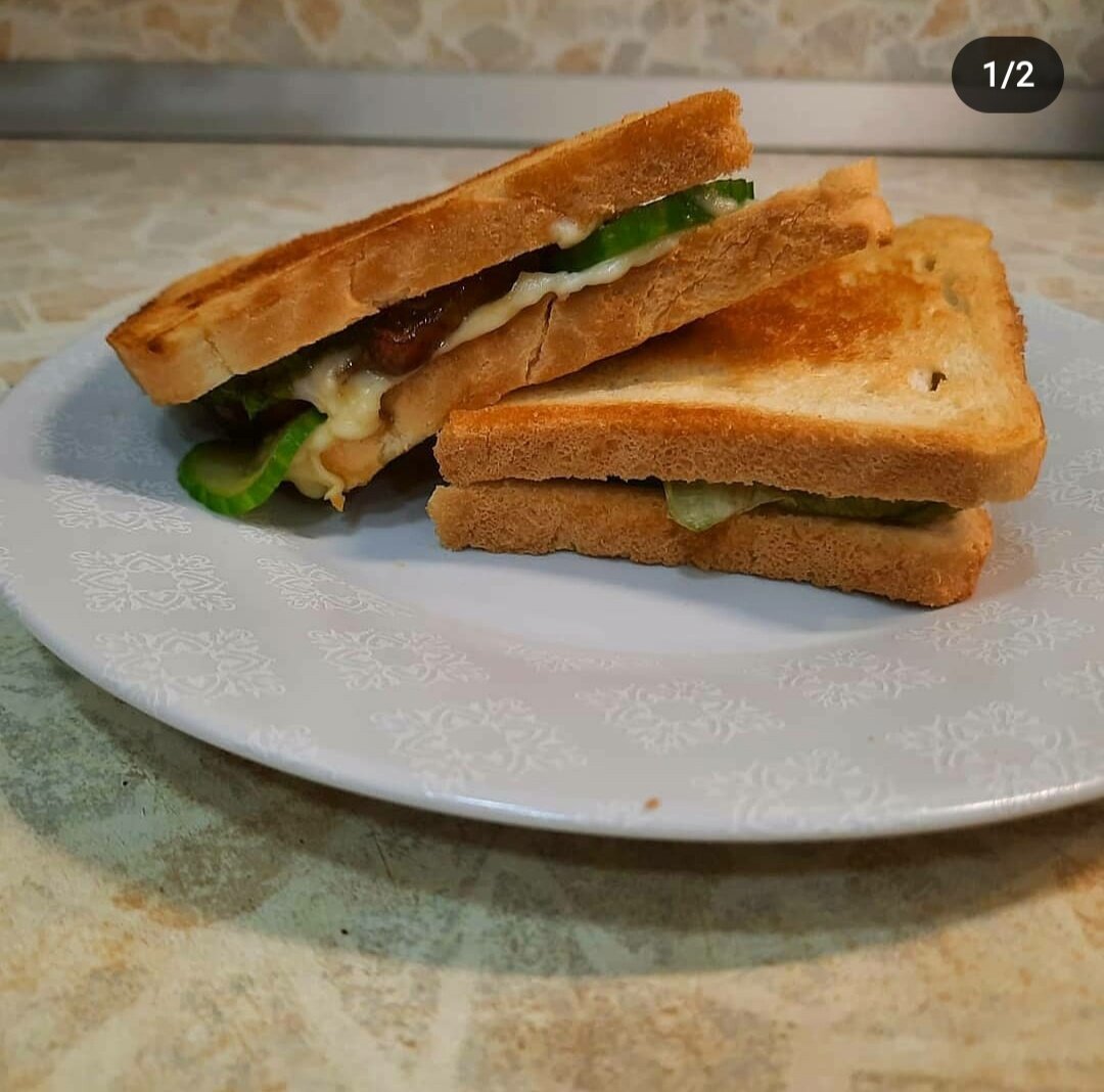 На 2 кусочка хлеба кладём лист салата, затем слой сыра, далее мясо (столько, чтобы был по всей площади сэндвича), несколько тонко нарезанных кружочков огурца, снова сыр и лист салата. Закрываем сверху оставшимися кусочками хлеба. Разогреваем сковородку, предварительно смазав небольшим кусочком сливочного масла и сразу отправляем на нее наши сэндвичи. Жарим с 2 сторон на средней температуре по паре минут или до тех пор пока хлеб не зарумянится и не станет хрустящим. Можно жарить с прикрытой крышкой, чтобы сыр расплавился посильней. Так же можно всё приготовить на гриль-сковороде. Когда сэндвич готов, то можно разрезать его на две части по диагонали.