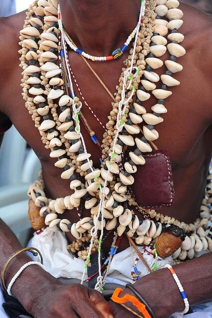 Наверное вы замечали, если просматривали фото с африканскими шаманами и жрецами, на шее, ногах, плечах и запястьях разнообразные по цвету и фактуре бусы. Эти украшения надевают и мужчины и женщины. Их называют «элеке» на йоруба. Они освящаются и кормятся. И после этого становятся священными предметами. Используются для защиты или успеха. И посвящены какому-то определенному духу. Например: 🔘 красно-черные посвящены Легба (или Эшу) 🔘 красно-белые - Хэвьессо (или Шанго) 🔘 белые - Сэгбо (Обатала) или Минона 🔘 бело-желто-синие - Мамми Уата И тд и тд 🎓🎩По количеству бус, их разновидности можно понять кто перед вами и какое место он занимает в традиции: новичок или мастер культа. Когда я впервые увидела своего мастера, он был одет довольно просто: белая майка, шорты-бриджи, поверх которых был обернут белый пань (белая ткань) и в общем-то все. И тогда я спросила, а почему на вас нет бус? И мне ответили: «мне не нужно надевать бусы, чтобы быть боконо». Это тоже самое и про ат
