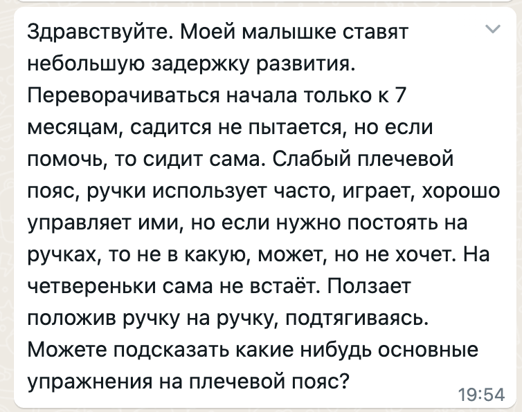 Недавно получил вопрос от мамы по поводу небольшой задержки развития ребёнка в 7 месяцев. Мама интересовалась, чем она может помочь дочери в этом случае. Читайте вопрос и мои рекомендации. Возможно кто-то оказался в схожей ситуации. Подпишитесь на @massagist_novokrinitskii, чтобы первыми видеть новые публикации на канале:) Задержка в развитии в 7 месяцев Малышке на приёме невролог поставил небольшую задержку развития: Мама просит подсказать какие-нибудь упражнения на укрепление плечевого пояса ребёнка. Мои рекомендации Я настоятельно рекомендую заниматься комплексно: А не укреплять только плечевой пояс. Кроме этого не советую помогать садиться, если ребёнок этот навык ещё не освоил. Малышка ещё не готова удерживать себя даже в горизонтальном положении (не встаёт на четвереньки), а мама даёт уже вертикальную нагрузку. Лучше всего акцентировать своё внимание на освоении ползания на четвереньках. На моём курсе 6-9 месяцев под кураторством специалиста мама поможет малышке укрепить все её м