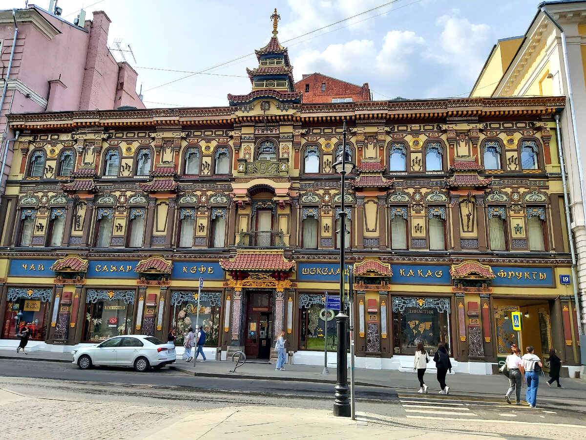 Вчера я была на Мясницкой и, конечно же, зашла в Чайный дом. У него интересная история. Это трёхэтажное здание хорошо известно жителям Москвы своим необычным видом, его иногда называют "китайской шкатулкой". Оно использовалось с 1893 по 1917 год как чайный магазин и доходный дом и принадлежало купцам Перловым.