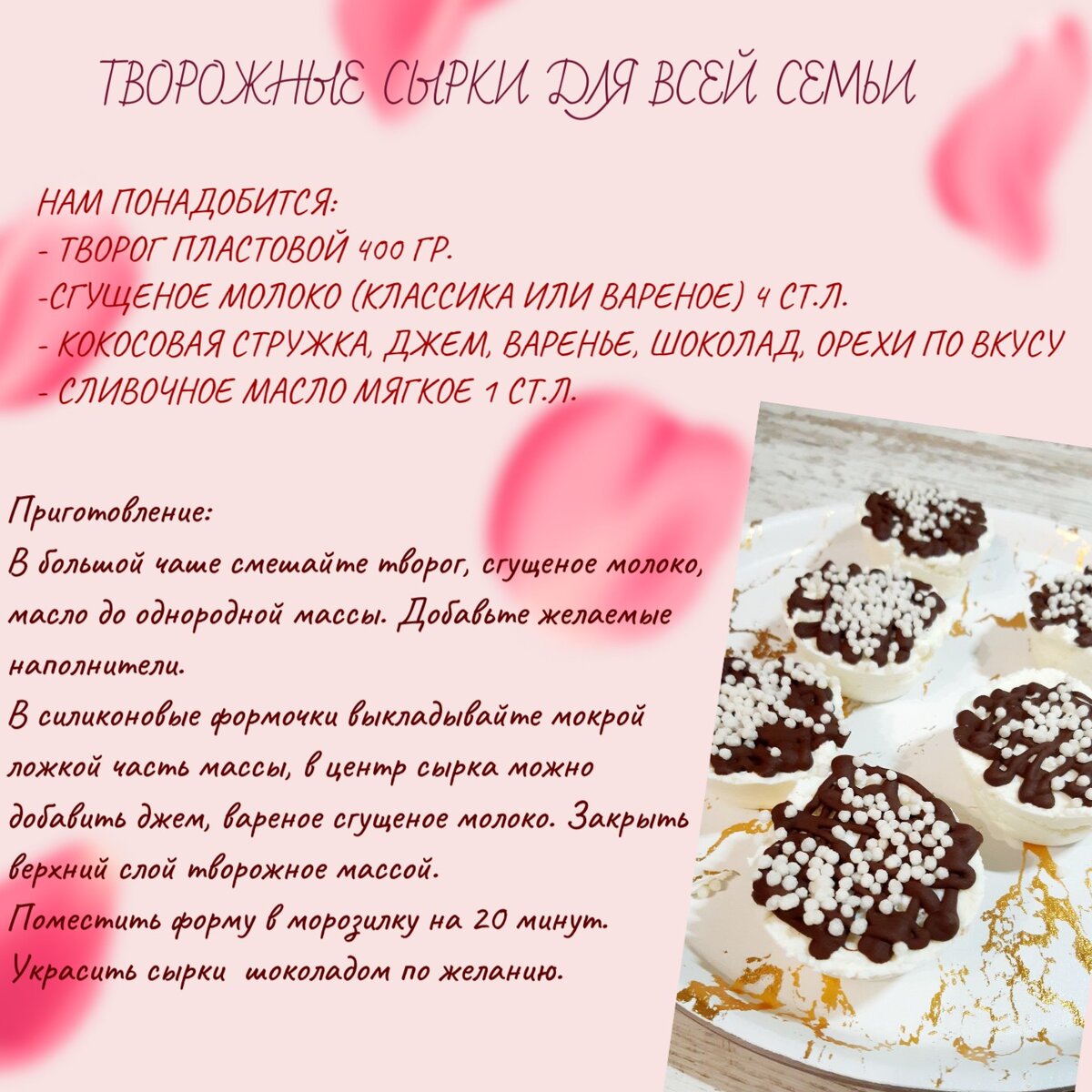 Быстро. Просто. Полезно. Вкусно. Сырки любят взрослые и дети, но сейчас на прилавках супермаркета всё реже можно встретить действительно полезный сырок с минимальным составом. Магазинный сырок порой страшно покупать ребенку. На самом деле классический сырок готовится за считанные минуты. Для его приготовления нам потребуется минимальный набор продуктов - творог, сгущенка, масло и любимые наполнители. Просто смешиваем всё по списку, выкладываем в силиконовые формы мокрой ложкой и отправляем в морозилку на 20 минут. А после украшаем растопленным шоколадом, присыпаем орехами или воздушным рисом. Такое лакомство придётся по душе и взрослым, и детям. Обратите внимание, что при использовании зернистого творога его необходимо заранее перетереть через сито или пробить блендером.
