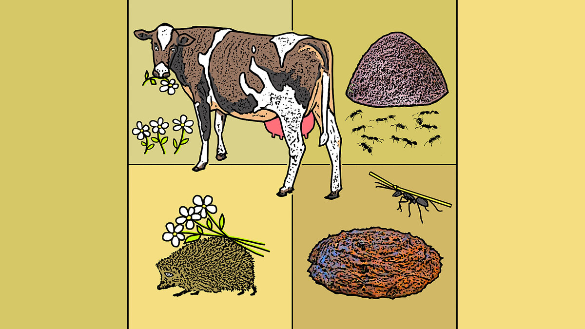 ᅠ ᅠ Стоит корова на лугу, Стоит, траву жуёт. Жуёт, жуёт, поднимет хвост - Лепешка упадёт. ᅠ ᅠ Бежит по травке муравей, Соломинку несёт. Тут неожиданно его Лепешка погребёт. ᅠ ᅠ Вот так бывает - раз, и нас - Невзгодами прибьёт. Кто знает, что еще судьба Нам завтра припасёт? ᅠ ᅠ А горемычный муравей Ход в куче раскопал, Протиснулся на белый свет И к дому побежал. ᅠ ᅠ