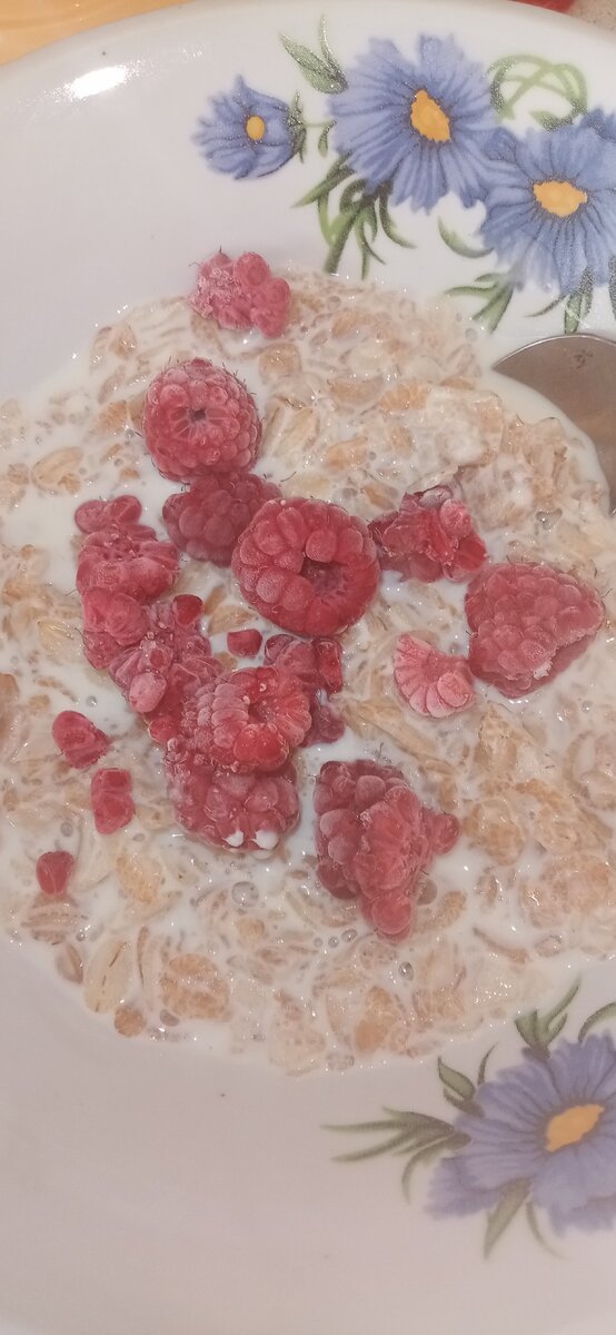 Сегодня по плану был овсяноблин с бананом, но банан я вчера нк купила. Поэтому у меня каша с ягодами (взяла из завтрашнего меню). Из ягод у меня малина. Получилось очень вкусно