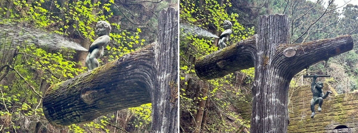 Этот находится в Японии (Сайтама) В городе Огосе близ плотины Акасакадзава туристы могут отыскать мальчика распыляющего широкую струю родниковой с высоты нескольких метров. Установлен в 1991 году и является постоянно действующим, потому что находится на 100 метров ниже источника воды.