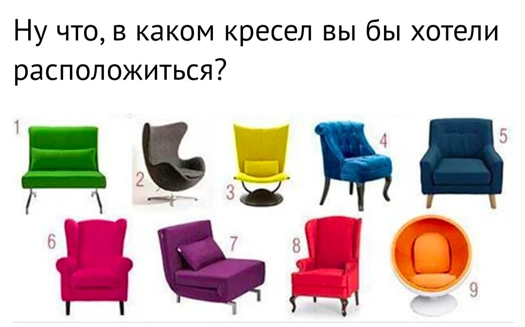 Всех приветствую🙂 Усаживайтесь поудобнее, потому что я с очередным психологическим тестом☝😁 А садиться вы будете в выбранное вами кресло- Подумайте как следует😃 Ответы ниже- Кресло 1- кресло бизнесмена😎 Вы — сильный и трудолюбивый человек. Можете целый день просидеть над трудным и нудным проектом. Трудоголик, но в отличие от большинства трудоголиков имеете здоровое отношение к работе. Вы никогда не боитесь высказать свое мнение, уверены в своих силах. Кресло 2- кресло духовного наставника🧘♀️ Вы — спокойный и сочувствующий человек, помогающий людям. Альтруист. Можете целый день просидеть в кресле, слушая другого человека. Вы добры и благодушны. По вашему мнению, настоящий человек — это тот, кто помогает другим людям. Именно таким вы стараетесь быть. Вам под силу успокоить даже самого беспокойного человека. кресло 3- кресло изобретателя 👩🔬 3. Вы выбрали «Кресло изобретателя» Вы — энергичный и передовой человек. Можете целый день просидеть на одном месте, разрабатывая идею.