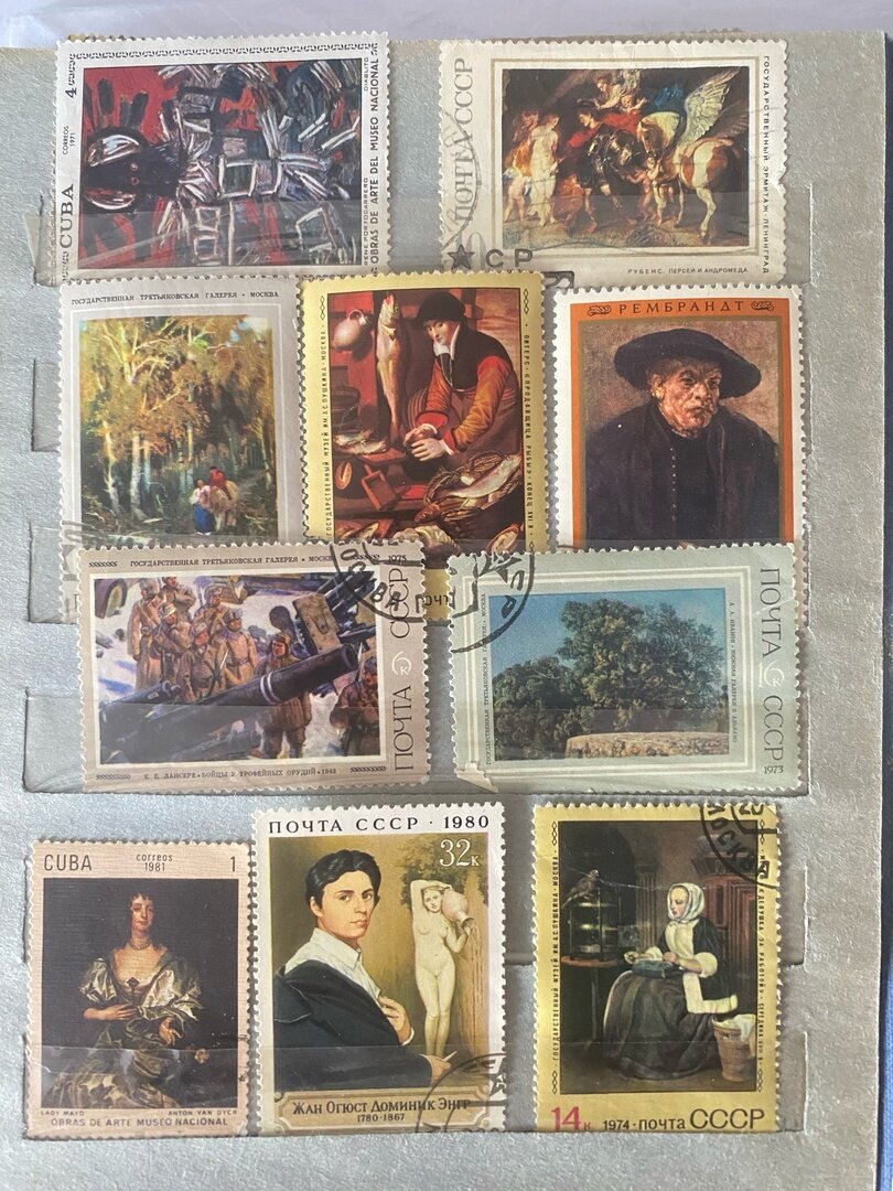 В комментариях к одной из статей подписчица Olga задала мне вопрос - что я коллекционирую. Вопрос, и впрямь, интересный. Обговорить его не мешало бы. Думаю, многим рассказать есть о чем. И я стала вспоминать свои коллекции в детстве, юности. Чего только мы не собирали! На даче до сих пор ящик с разноцветными камешками стоит. Камешки выдержали время вполне сносно. Многие детские коллекции оказались выброшены или истреблены детскими ручками, а вот два кляссера сохранились. В школе у нас буквально эпидемия была. Все собирали марки, и киоски делали на нас хорошую выручку. Кляссеры, достаточно потрепанные жизнью, я открыла и увидела.... картинную галерею! Хорошо помню, как мы разглядывали эти марки, как ждали, когда их завезут в киоск, как экономили на обедах, чтоб купить такие, каких ни у кого нет. На фото первая картинная галерея. Многие страницы уже так потрепаны, что фото их показывать стало уже неудобно. Детишки постарались в свое время, а взрослые не доглядели. А Вы что-нибудь ко