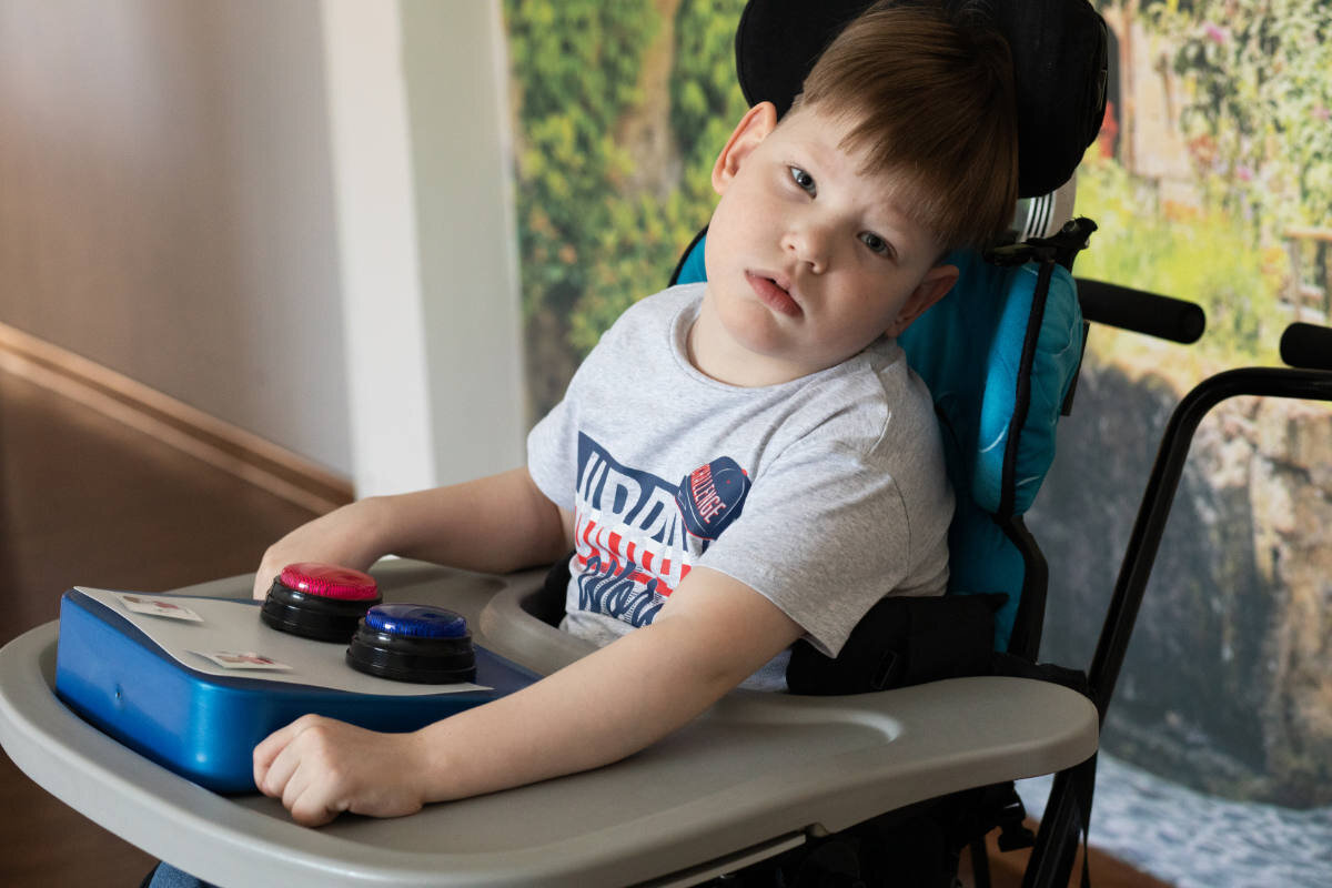 В восемь месяцев Назар Сухих из Барнаула уже учился читать. Да, мама Инга знала, что у Назара детский церебральный паралич IV уровня по шкале моторных функций, она понимала, что это навсегда, но торопилась дать ему максимум возможностей. Она показывала ему карточки Домана (целые слова) и отдельные буквы, занималась с ним адаптивной гимнастикой. У него стала развиваться речь. Но в два с половиной года вдруг пропали даже те навыки, которые были уже наработаны. Назар совсем перестал говорить. Однако буквы он не забыл. «Если выложить вперемешку буквы, например «с», «т», «о» и «л», то, указывая пальцем на каждую из них по порядку, Назар соберет слово „стол“, – рассказывает Инга. – Правда, это будет очень долго. У Назара работает только один палец». Да и тот плохо его слушается. По сути, самой активной частью Назара стали глаза. «Однажды к нам на занятия по альтернативной коммуникации привезли айтрекер. Я увидела, что у Назара есть шанс читать, печатать, общаться с помощью переписки, а также