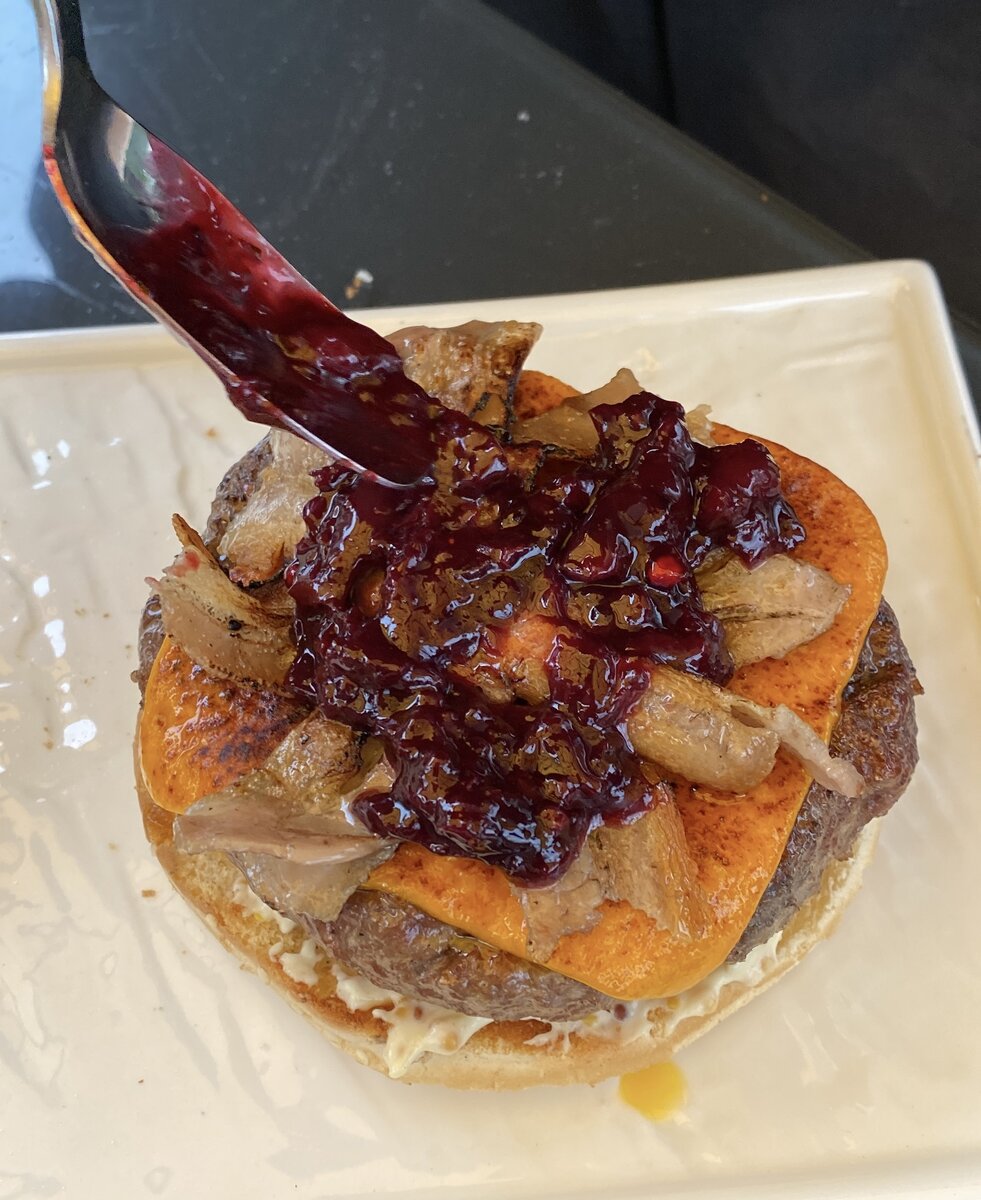 📌Бекон Для начала сделаем самое важное - соусы. Начнём с сырного: в миске смешиваем две столовые ложки майонеза, чайную ложку дижонской горчицы, пол чайной ложки русской горчицы, соль и перец, чайную ложку трюфельного масле, затем добавляем пармезан и знайте, что его много не бывает, но помните, что должна получится консистенция густой сметаны. Затем сделаем вишнёвый: в сотейник высыпаем чуть меньше половины пачки замор