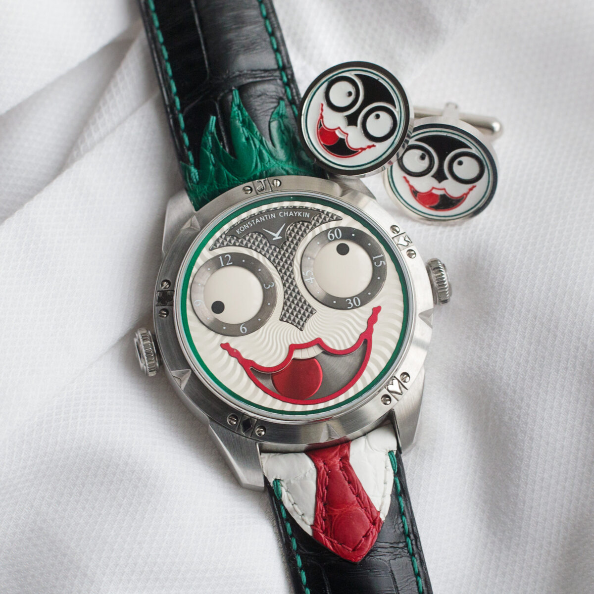 Первая обыгрывает удачнейшую модель "Клоун", являющуюся визитной карточкой Чайкина. Белая поверхность циферблата представлена в радиальном волнистом узоре, на периферии находится зелёное кольцо разметки, а за индикацию времени отвечает весьма оригинальная апертура, выполненная, неудивительно, в регуляторе.