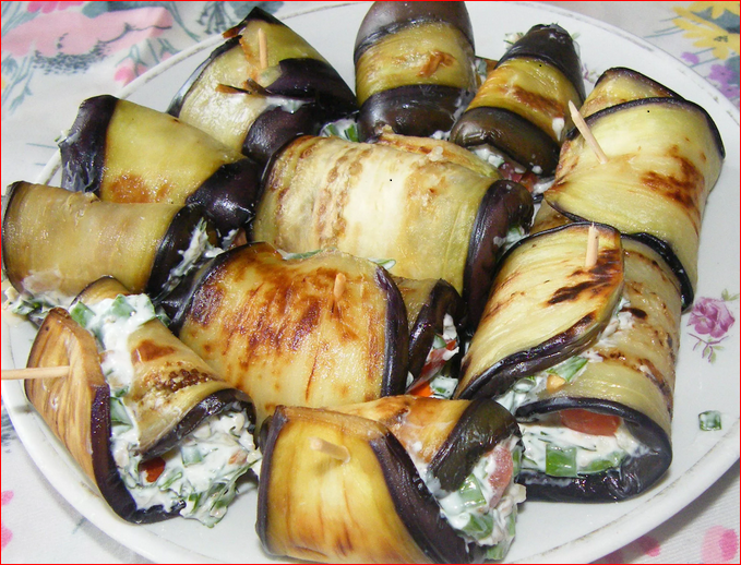 Закуска с приятной остротой и восхитительно вкусная. Её можно легко готовить не только для подачи гостям, но и для семейного обеда или на ужин. Съедается легко и быстро, рецепт заслужил множество хороших отзывов. Закуска из баклажанов - Тёщин язык Понадобится: Как делать закуску Баклажаны режем вдоль, тонкими не более полсантиметра ломтиками. Слегка солим и обжариваем на сковородке с маслом. Готовые баклажаны рекомендую выложить на салфетку, чтобы она впитала лишнее масло. Начинка - трем брынзу на тёрке и смешиваем со сметаной, пропущенным через пресс чесноком и мелконарезанной зеленью. Помидоры режем тонкими ломтиками, рекомендую брать мясистые, чтобы было меньше сока внутри. На каждый ломтик баклажана выкладываем немного начинки из брынзы, кладём ломтик помидора и аккуратно (не передавливая) сворачиваем в рулетик. Чтобы закрепить край, закалываем его зубочисткой. Готовые небольшие рулетики укладывем на тарелку и подаём на стол. Какие они вкусные! Аппетитная закуска, которую съедают в
