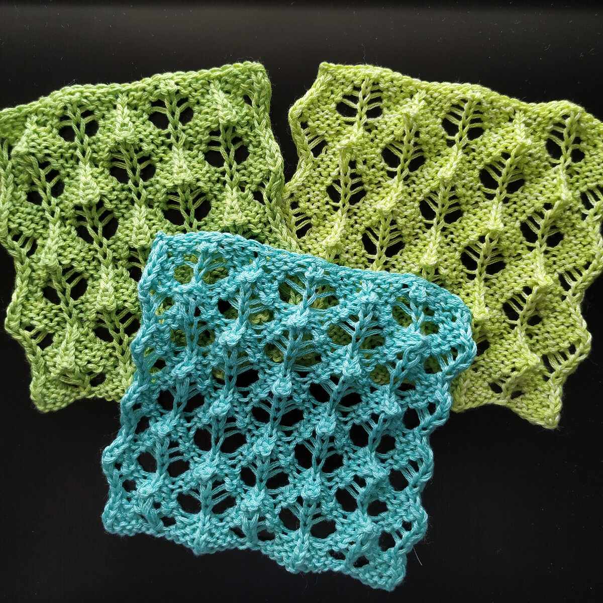 Итак, на повестке дня третья часть Мерлезонского балета. Это завершающая статья из серии, посвящённой узору с объемными ажурными листиками. Первая часть тут, вторая тут. И сегодня я показываю два оставшихся варианта этого узора, они на фото на заднем плане, а образец, который лежит сверху, то есть первый вариант, мы рассмотрели в прошлой статье. Напомню, его схема выглядит так: Другие два образца имеют раппорт покрупнее, чем у узора, показанного в прошлый раз. Итак, вариант узора номер два. Это лицевая сторона: А это изнанка: Технически второй вариант отличается от первого тем, что над каждой четвёркой рядов с накидами добавлено ещё 2 ряда, в которых нет ни накидов, ни убавок, а петли просто вяжутся по рисунку, то есть над лицевыми вяжем лицевые петли, а над изнаночными – изнаночные. Таким образом, суммарно раппорт узора подрос в высоту на 4 рядочка (было 8, стало 12). В ширину же раппорт остался таким же, как и в первом узоре (10 петель). При этом визуально узор смотрится крупнее, ч