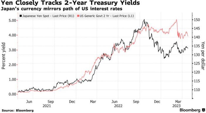 Аналитик Фишман пишет, что иена лучше всего выражает направление с учетом динамики ставок Goldman Sachs Group Inc. рекомендует три валютные сделки для инвесторов, которые хотят ориентироваться на рост процентных ставок. Вместо того, чтобы торговать долларом, инвесторы должны сосредоточиться на иене, евро и товарных валютах, чтобы получить более высокую прибыль, пишет в заметке стратег Карен Райхготт Фишман. Покупайте иену, чтобы сделать ставку на более низкие процентные ставки в США, или продавайте ее, чтобы разыграть противоположный сценарий, сказала она. Евро и товарные валюты — это то, где инвесторы могут делать ставки на фондовых рынках, поскольку на них влияют процентные ставки. По словам эксперта, медведям следует продавать австралийский или канадский доллар по отношению к иене, в то время как быки могут покупать евро по отношению к японской валюте. Иена внимательно отслеживает доходность 2-летних казначейских облигаций | Японская валюта повторяет траекторию процентных ставок в С