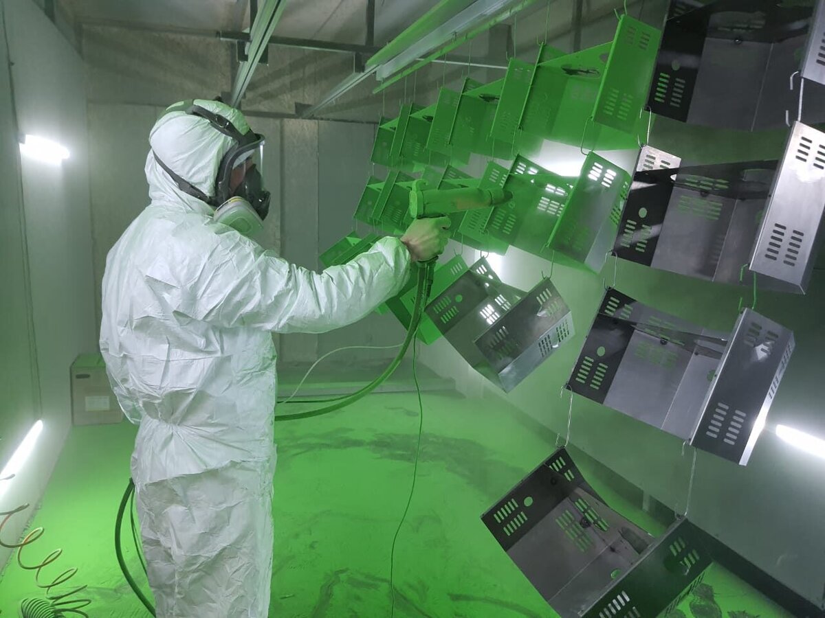 - Нанесение слоя порошковой краски. На поверхность в камере напыления специальными пистолетами-распылителями. В процессе этого - электростатические заряженные частицы порошковой краски, при прохождении через пистолет, прилипают к окрашиваемой поверхности.