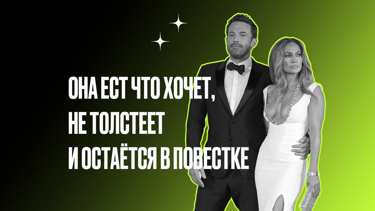 Она ест что хочет — и не толстеет! На шоу Дрю Бэрримор Аффлек рассказал, что в свои 53 года актриса позволяет себе и пиццу, и мороженки, и всякие другие плюшки — и всё равно «выглядит как двадцатилетняя». Реплику насчёт двадцатилетней мы оставим на совести любимого супруга актрисы. Кстати, откуда бы ему знать, как выглядит двадцатилетняя Лопес, когда во время их знакомства Дженнифер, извините, вплотную подошла к возрасту Христа? ;) Понятное дело, что съеденные плюшечки Лопес в поте застрахованных форм лица отрабатывает в спортзале. И это не 45 минут три раза в неделю как у Бритни Спирс. Но, как справедливо заметил Аффлек, многим одного спорта не хватает, и приходится жестко себя ограничивать. Что и говорить, на свои полста с гаком Джей Ло никак не выглядит. Её «костюм Евы» ещё вполне годится в качестве купального. И да, на вопрос Дрю, давно ли Бен плавал нагишом, актер ответил, что вот буквально недавно. Вместе с Джен, в бассейне, на отдыхе. И он считает, что нет ничего прекраснее, чем