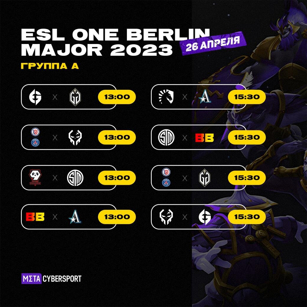 26 апреля на ESL One Berlin Major 2023 пройдёт первый тур встреч команд в рамках групповой стадии. Данный этап турнира продлится до 30 апреля включительно. По итогам стадии шесть коллективов покинут чемпионат. Стартовые матчи группы А начнутся в 13:00 по московскому времени. EG сыграет с Gaimin Gladiators, PSG.LGD встретится с Execration, 9 Pandas сразится с TSM, а BetBoom Team поборется с Team Aster. Следом в 15:30 по московскому времени в игру вступит Team Liquid. Первым соперником для команды станет Team Aster. Остальные команды поменяются оппонентами. 9 Pandas также сыграет лишь 1 матч в рамках первого тура. Стартовые матчи группы В запланированы на 18:15 по московскому времени. Tundra Esports сыграет с Team Spirit, Talon Esports встретится с beastcoast, Shopify Rebellion столкнётся с Invictus Gaming, а Team SMG поборется с OG. Следом в 20:45 по московскому времени в игру вступит Xtreme Gaming. Команда встретится с OG. Остальные коллективы поменяют соперников. Тем не менее, как 9 P