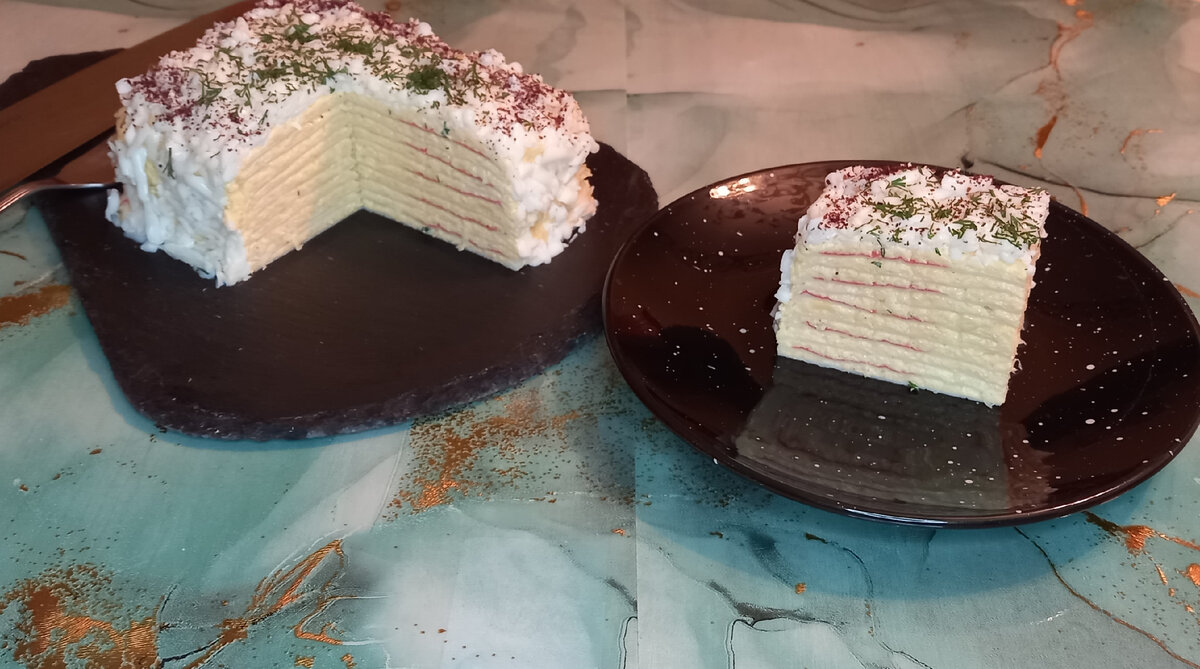 Как я сказал ранее, рецепт очень быстрый и очень простой. Яйца кладём в кастрюлю, заливаем водой, ставим на огонь и варим до готовности. Далее заливаем холодной водой, остужаем, чистим и отделяем желтки от белков. Желтки натираем на мелкой тёрке, белки на крупной. Желтки отправляем в глубокую ёмкость, белки пока убираем в сторонку. Сыр натираем на мелкой тёрке и перекладываем к желткам. Чеснок натираем на мелкой тёрке и отправляем к сыру. По количеству чеснока всё зависит от ваших вкусов. Если любите чеснок, то не жалейте его. Добавляем соль, перец, майонез и хорошенько перемешиваем. Далее берёмся за крабовые палочки. Каждую из них разворачиваем в ровный пласт. Здесь лучше не экономить и взять качественные палочки, их будет проще развернуть. Если у вас всё же появились проблемы с этим, то перед разворачиванием залейте палочки горячей водой буквально на одну минуту. Приступаем к сборке тортика. Кладём первый пласт крабовой палочки. Сверху ровным слоем наносим сырную начинку. Затем кладём второй пласт. Но кладём его красной стороной в другую сторону. Снова слой начинки. Затем третий слой, четвёртый, пятый и так далее, чередуя красную сторону крабовой палочки с белой. Как только все слои собраны, оставшейся начинкой смазываем торт со всех сторон и обсыпаем натёртым белком. Готовый тортик убираем в холодильник минут на 30 и блюдо готово.