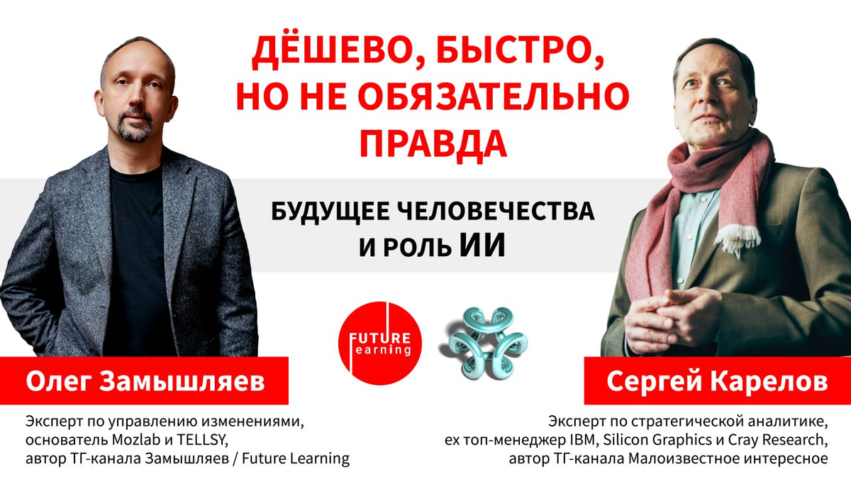 Будущее человечества и роль ИИ Моё большое интервью Олегу Замышляеву — основателю консалтинговой компании Mozlab, сервиса TELLSYи автору ТГ канала «Замышляев / Future Learning», — попытка заглянуть в ближайшее будущее начавшейся «революции ChatGPT». Обсуждаемые в интервью вопросы нетривиальны. А некоторые из них даже могут показаться нереалистичны: Однако, слушая десятки противоречивых экспертных мнений о перспективах «революции ChatGPT», невольно задаешься вопросом: Этим вопросом я заинтересовался еще в 2012 (тогда публичных экспертов по ИИ было сильно меньше, чем сегодня 😊). А в 2017 я попытался проанализировать реализм прогнозов по изменениям в ответах экспертов по ИИ между 2012 и 2017 годами. В явном виде были зафиксированы, как минимум, 2 тренда. Практика показала, что и в 2023 оба тренда близки к реальности. А 2й, похоже, реальностью уже превзойден. В своем большом интервью Олегу Замышляеву я пытаюсь выявить новые важнейшие тренды с позиций начавшейся «революции ChatGPT». Интере