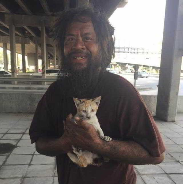 Бездомный мужчина подкармливает уличных котов, вопреки тому, что голодает сам