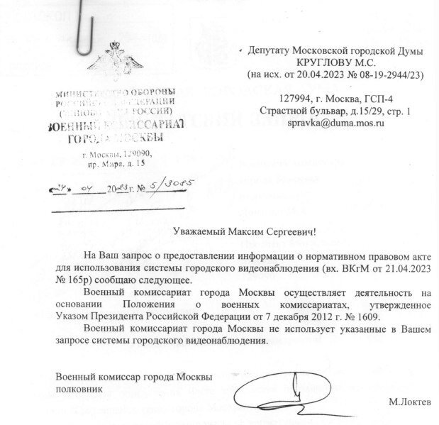 Возможно, формально слежку ведут не военкоматы, а структуры мэрии и МВД, считает депутат Военком Москвы Максим Локтев опроверг самого себя в ответе на мой депутатский запрос: московские военкоматы не используют городскую систему видеонаблюдения для слежки за призывниками, написал он мне, хотя неделю назад публично говорил об обратном. «Для определения места жительства призывника используются системы видеонаблюдения города Москвы…», – заявлял тогда полковник Локтев (цитата по ТАСС). А вот его же цитата в ответе на мой запрос, в котором я интересовался, есть ли какие-то правовые основания у такой практики слежки: «Военный комиссариат города Москвы не использует указанные в Вашем запросе системы городского видеонаблюдения», – пишет военком-минималист, уложивший свой ответ в одно предложение. Как вы думаете, где он сказал правду? Возможно, формально систему слежки используют не военкоматы, а структуры мэрии и МВД, о тесной кооперации с которыми в этом вопросе Локтев тоже упоминал. Только
