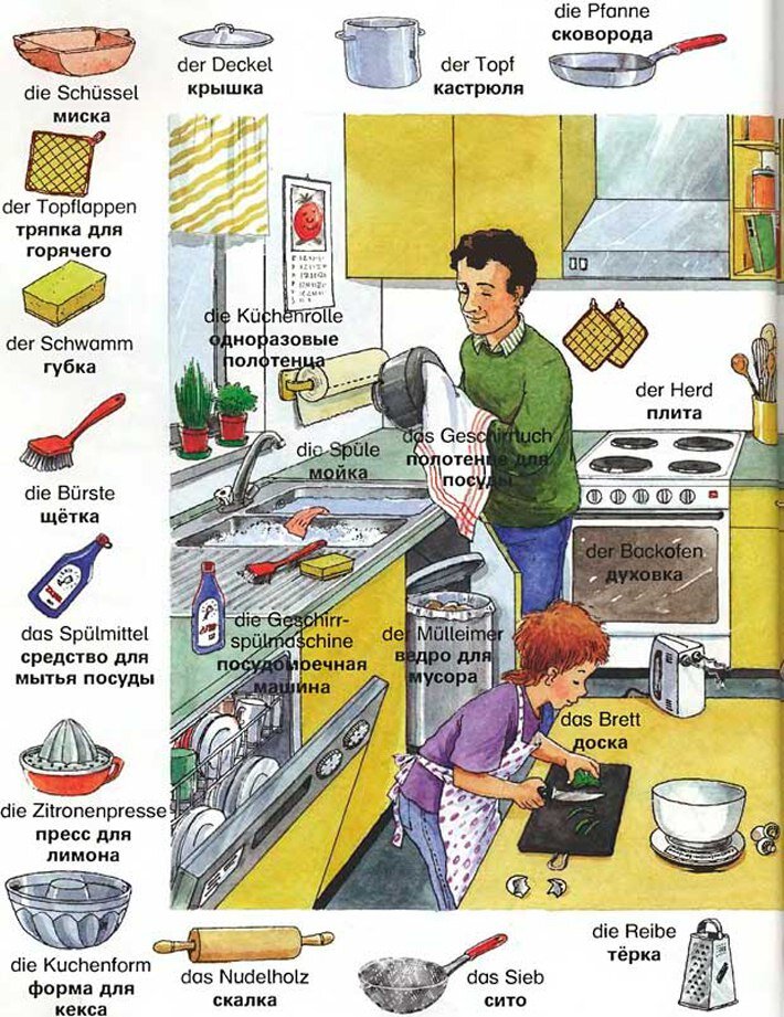 - "Ich muss das Geschirr spülen" (Мне нужно помыть посуду) - в этом случае глагол "spülen" означает, что нужно помыть грязную посуду.