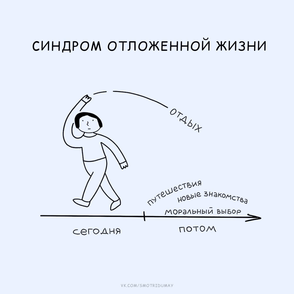 Отдохнуть завтра. Прогуляться с друзьями читнадцатого числа, чтобы провести с ними время. Поехать к маме в дату «х», которая настанет никогда или, как минимум, лет через дцать. Подождать переломного момента в будущем, чтобы начать действовать так, как хочется. Звучит, как «синдром отложенной жизни», от создателей: «Сервиз стоит для особого случая» и «Вот закончишь школу, тогда и поговорим». Только вот проблема в следующем: Вы никогда не достигнете точки в вашей жизни, где всё разрешится, где всё будет аккуратно перевязано бантиком. В этом-то всё и дело. Не будет «финальной сцены», только происходящий приключенческий фильм без финального завершения. Вы учитесь любить беспорядок вашей жизни, её постоянно изменчивую природу, её непредсказуемость. И вы стоите, как неизменное молчание в самом центре бури, как широкое открытое пространство, в котором радость и боль, экстаз и агония, скука и блаженство могут возникать и спадать, подобно волнам в океане. И нет проблем, когда вы знаете се