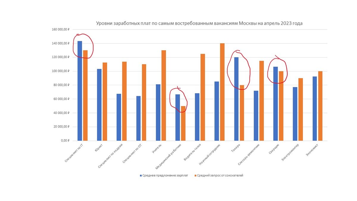 На нашем канале открываем еженедельные исследования по уровням заработных плат наиболее востребованных профессий по регионам Российской Федерации. Обзоры проводим на основе данных 3 крупнейших агрегаторов поиска персонала и работы. Поэтому показатели формируем в части пожеланий соискателей и предложений работодателей. В нашем исследовании приняли участие тринадцать профессий рынка труда Москвы. По результатам исследований установлено, что по четырем профессиям предложения работодателей и запросы соискателей отклоняются не более чем на 10 %. Поэтому можем утверждать, что специалисты по IT, медицинские работники, токари, сварщики являются наиболее востребованным и перспективными. При этом, превышение значений зарплат по предложениям предприятий и организаций от значений запросов соискателей предполагает, что на рынке не хватает наиболее квалифицированных кадров выявленных профессий. В пользу данного утверждения указывает то, что более 50% вакансий по этим профессиям с заработными платами