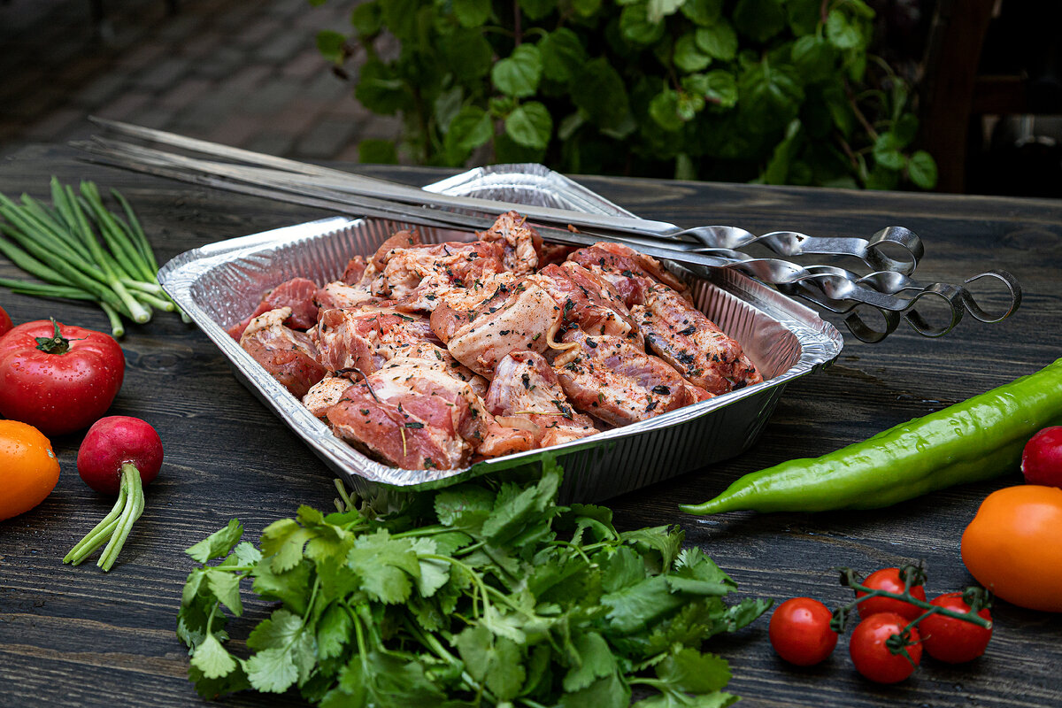 - Овощи и грибы промыть и нарезать на крупные куски. Куски маринованного мяса надеть на шампур, чередуя с овощами.