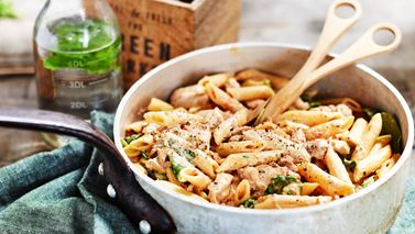Пришло время объединить силы! Переверните шпинат, добавьте его в соус, затем аккуратно смешайте с макаронами. Ваше блюдо готово к подаче! Филе куриного бедр