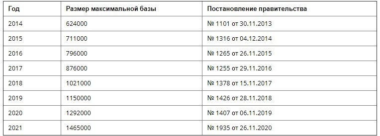 Размер максимальной базы для начисления взносов на пенсию назначается правительством на каждый год. Скажем, при расчетах в 2021 году используется размер максимальной базы (ПБ), составляющий 1465000 рублей.