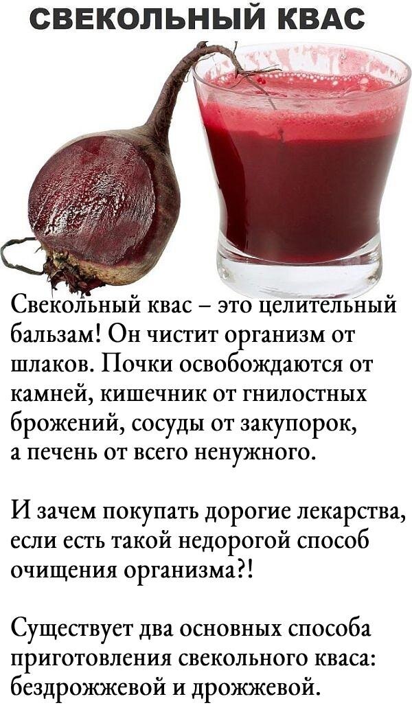 — 100 г сахара Сырую свёклу тщательно промыть, очистить, нарезать тонкими ломтиками и подсушить в духовке. Затем залить небольшим количеством горячей воды (чтобы вода только покрывала свёклу) и варить до готовности. Отвар слить, долить оставшуюся кипяченую воду (полученный отвар должен быть приятно тёплым), положить черный хлеб, сахар, дрожжи и оставить на 1-2 дня в теплом месте для брожения. Затем квас процедить и охладить. Свёклу, оставшуюся от тушения, использовать для приготовления других блюд. 2 способ
