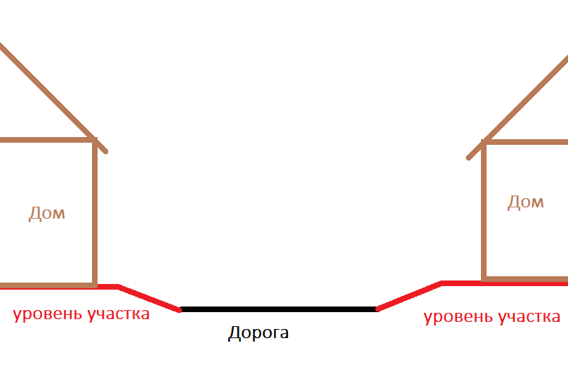 В продолжение темы водоотвода, начатой в прошлой статье, хочу поделиться своими мыслями по более глобальному вопросу. Конкретно - про дождевую и талую воду на дорогах в нашем поселке. По этой теме моя пятая точка стала подгорать еще до переезда, когда только началось обильное таяние снега. С приходом весны дороги в поселке превратились в болота, местами глубиной по колено. Хотя казалось бы, поселок на небольшой возвышенности, есть уклон к проходящей неподалеку речушке. Да вот только что такое дренажные канавы у нас к сожалению никто не знает, или попросту в отсутствие централизованного управления застройкой некому было этим озаботиться. Зато каждый постарался отсыпать свой участок повыше и профиль дороги получился вот такой: Куда тут воде деваться? Только очень медленно уходить сквозь саму дорогу, щедро отсыпанную асфальтовой крошкой. А на одной из улиц жильцы придумали просто "гениальнейшее" решение - закатали участок дороги метров 70 в длину и 10 в ширину в асфальт, сделав уклон к