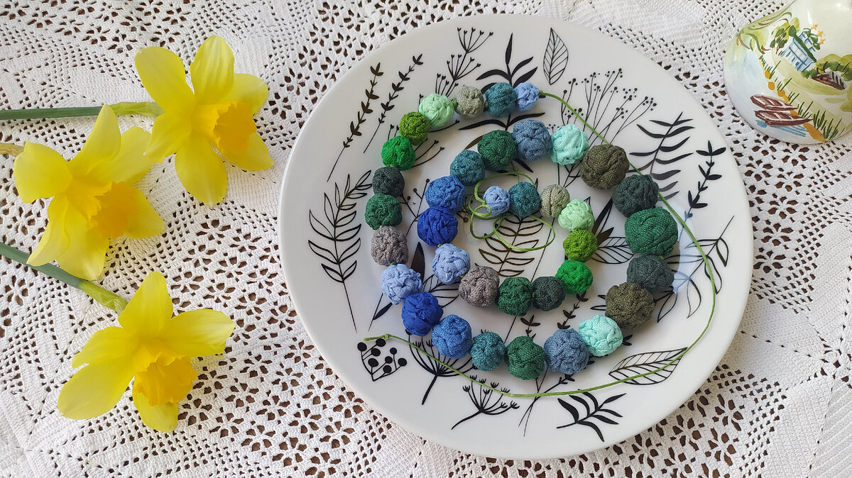Низка бус - так называли украшение, собранное на ниточку ожерелье с застëжкой, с лентами-завязками или просто круговое. Видео в финале статьи, обязательно долистайте, рассмотрите мои лоскутные самоцветы. Низка - потому что нужно нанизать, собрать последовательно бусинки самоцветные, хоть из камешков ярких, хоть из стеклянных, бисерных капелек, хоть из лоскутных кругляшков. Сборка бусин на леску, нитку, шнурок - дело ответственное. О нëм и поговорим. Поместить каждую бусину на своë место, чтобы зафиксировалась и не "ездила", не портила свою форму и не искажала общий строй - это не просто, а очень просто. Щедро раскрываю секрет! Подготовительный этап Сшила я из льняных квадратиков разного размера много бусин, помельче и покрупнее. Ничего, кроме лоскутка, иголки и нитки тут не нужно. Если интересен процесс их создания, пишите в комментариях, сниму отдельно. Можно круглые мягкие бусины, синтепоном наполненные, подготовить. Или иные красотульки собрать. Вот они, на тарелочке - лос