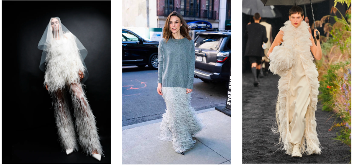 Перья – не новинка этого сезона: мода на них не сбавляет оборотов с сезона осень-зима 2022. Но если в тот момент они ассоциировались почти исключительно с историей “на выход”, то сейчас этот тренд, как и положено любому тренду, адаптировался под человеческую повседневность. Так что сегодня поговорим о том, как стилизовать перья на каждый день. Total-feather pieces Вещи, которыми стоит обзавестись – на случай, когда хочется сразить всех наповал. В этом сезоне их предложили многие дизайнеры, и смотрится они впечатляюще и эпатажно. Собственно, почему бы и нет? “Перьевой костюм”, как у Lapointe, платье, как у Jil Sander, или юбка, как у Киры Найтли – осталось выбрать свое. Платье Еще один вариант, сильно полюбившийся дизайнерам и стилистам в последнее время. Платье, украшенное перьями – смело и выразительно. Длина при этом вовсе не важна: можно выбрать милое мини с перьями по подолу, можно трендовое в этом сезоне макси. Наш фаворит – платье Эйт – идеально для любой вечеринки. Лонгслив Каже