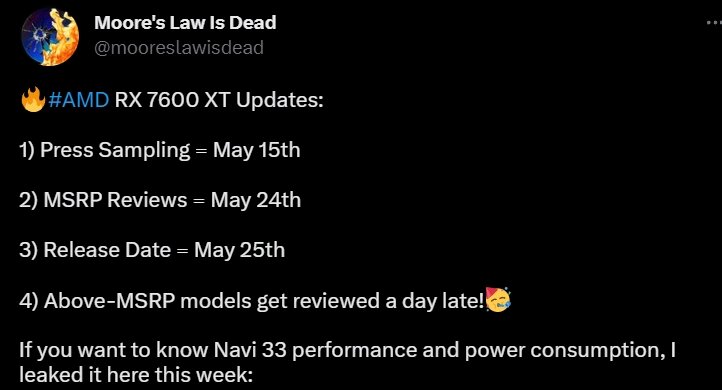 Ранее инсайдер Moore’s Law is Dead сообщал, что AMD представит видеокарты Radeon RX 7600 XT в конце мая или начале июня, а теперь он называет точные даты для публикации обзоров и старта продаж новинок. Так нам заявляют, что уже 15 мая видеокарты попадут в руки к журналистам и блогерам, а эмбарго на обзоры будет снято 24 мая. При этом уточняется, что речь идет о референсных исполнениях, а материалы о партнерских видеокартах будут опубликованы на сутки позже, в день старта продаж. Цены на AMD Radeon RX 7600 XT все еще остаются неизвестными, а потому остается только ждать дополнительной информации.