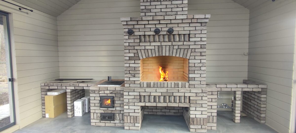 Барбекю комплекс из кирпича ручной формовки. Строительство барбекю будет производиться в закрытой беседке. Подготовили и согласовали проект будущего комплекса. Подготавливаем рабочее место: заносим кирпич, растворы. Пол защитили листами ДВП( оргалит). Начинаем кладку. Подвели воздух с улицы для мангала. Использовали воздуховод ф150мм. На третьем ряду пускаем ряд вертикально. Формируем место для мойки. Слева уже подняли ряды для опоры столешницы. Уложили не горючую изоляцию 100мм. Установили топочную дверку для плиты. Использовали тоннель из нерж. стали. Внутри топочной зоны используется огнеупорный кирпич. Перекрыли дровник. Сложили ряд кирпичей" гармошкой". Поднимаем кладку. Ширина очага будет ровняться 1000мм. Дошли до перекрытия мангала. Подготавливаем шаблон для арки. Подвели воздух с улицы в мангал. Подача с двух сторон. Сложили арочку. Подготавливаем место для установок двух поворотных шиберов. Сложили еще ряд "гармошки". Дымосборник в мангале. Построили леса, кладем дымоход.