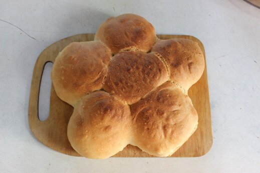 Сегодня предлагаю вам снова приготовить домашний вкусный хлеб. В этот раз будем делать его в виде ромашки. Ингредиенты: Приготовление: Наливаем в чашку теплую воду, примерно градусов 30. Добавляем дрожжи и сахар. Сюда же наливаем масло подсолнечное. Просеиваем муку. Делать это нужно обязательно, так хлеб получится более воздушным. Добавляем соль. Я всегда соль сыплю именно на муку, так она меньше контактирует с дрожжами и снижается вероятность опадания хлеба. Замешиваем тесто, сначала ложкой, затем руками. Вымешиваем до однородной массы. Тесто будет липнуть к рукам, так и должно быть. Не нужно добавлять муку иначе ваш хлеб получится плотным. Накрываем тесто полотенцем или крышкой и убираем в теплое место примерно на 1-1,5 часа. После того как тесто поднялось, приступаем к формовке. Делим тесто на 6 одинаковых шариков, выкладываем их в виде ромашки на смазанный противень. Я хотела еще изобразить узоры, но на конечном результате их практически не видно))) Накрываем хлеб полотенцем и дае