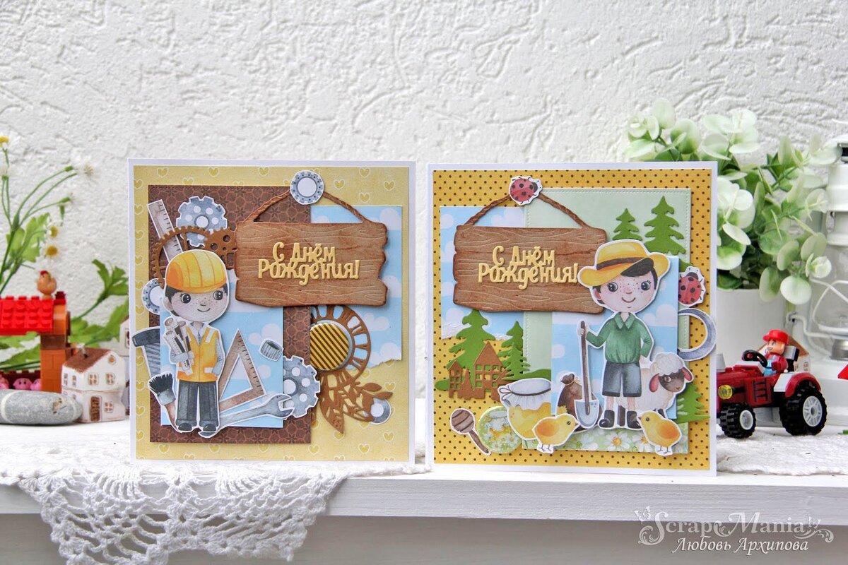 Всем привет! Сегодня с вами я, Любовь Архипова. Бывает ли у вас такое, что какие-то материалы вас очень вдохновляют и вы не можете решиться из них что-то делать? Вот у меня так бывает, лежат и ждут своего светлого часа, точнее когда же я придумаю что с ними сделать. И бывает идея прилетает очень внезапно, тут ты загораешься этой идеей и делаешь работу на одном дыхании. У меня давно лежал листик с картинками 10х30 см "Профессии. Строитель". Ходила вокруг него кругами, очень хотелось поп-ап с ним сделать, такой классный парень и много деталей на нем изображены. Потом у меня появился лист с картинками 10х30 см "Профессии. Фермер". И все, это было отправной точкой создать две задорные поп-ап открыточки. К ним в компанию удачно по стилю и цвету подобралась коллекция "Пчелки" TM ScrapMania. Формат открыток примерно 15х15 см. Первой я сделала открыточку с фермером. В основе лист бумаги "Пчелки. Теплое лето", принтом в горошек я оклеила внешнюю сторону открытки, а принтом с зеленым фоном и цв