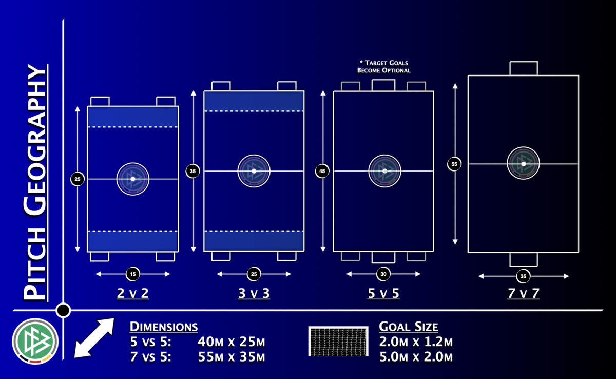 Немецкая футбольная ассоциация обновила свою программу соревновательных игр, в которую играют футболисты до 11 лет. Подход ориентирован на игрока. Немцы решили отказаться от традиционного формата игр. Вице-президент Ронни Циммерманн, отвечающий за детский и юношеский футбол, сказал: «Мы должны думать как дети, а не как взрослые. В футболе останутся только дети, которые получают удовольствие от игры». Детям на поле позволяют принимать решение самим без давления со стороны тренеров и родителей. Принципы развития: Немецкая ассоциация опробовала эту методику за последние 2 года во всех региональных ассоциациях, и отзывы детей были положительными. Все клубы в Германии должны будут ввести этот формат до начала сезона 2024/25. Упор делается на большее количество касаний, на регулярное повторение элементов, которые пригодятся во взрослом футболе, на индивидуальный успех игрока. Параметры нового формата Возраст 6-7 лет: Формат фестиваля: Возраст 8-9 лет: Возраст 10-11 лет: Наибольшее внимание у